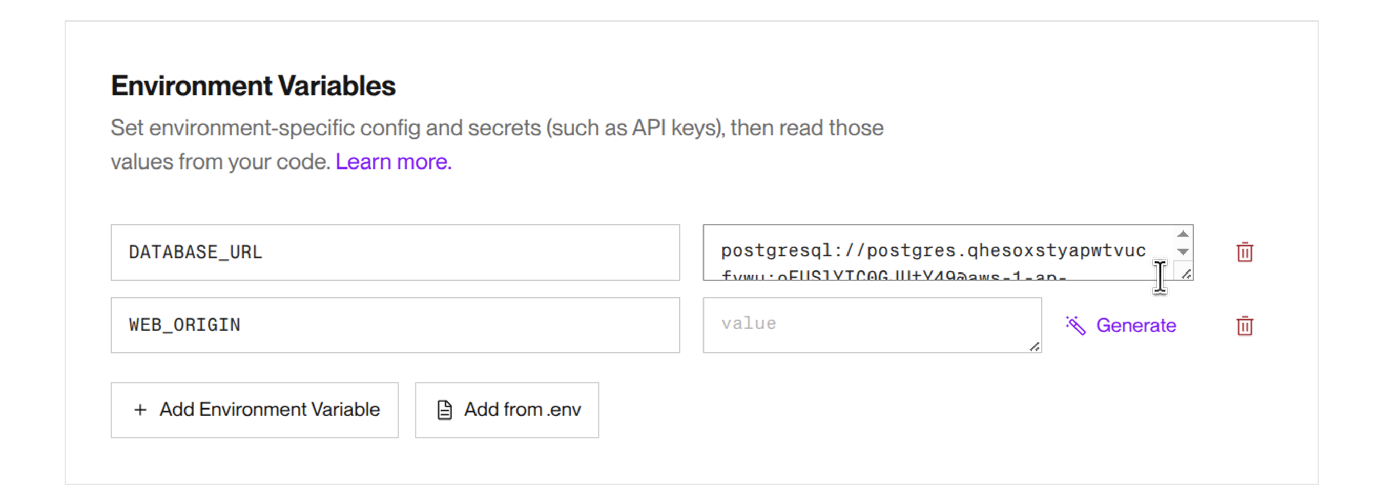 DATABASE_URLでデータベースへの接続情報を設定します。環境変数WEB_ORIGINは、ひとまず空のままにしておきます。